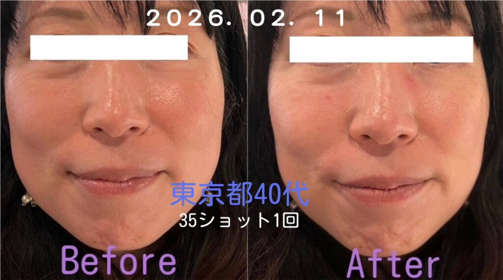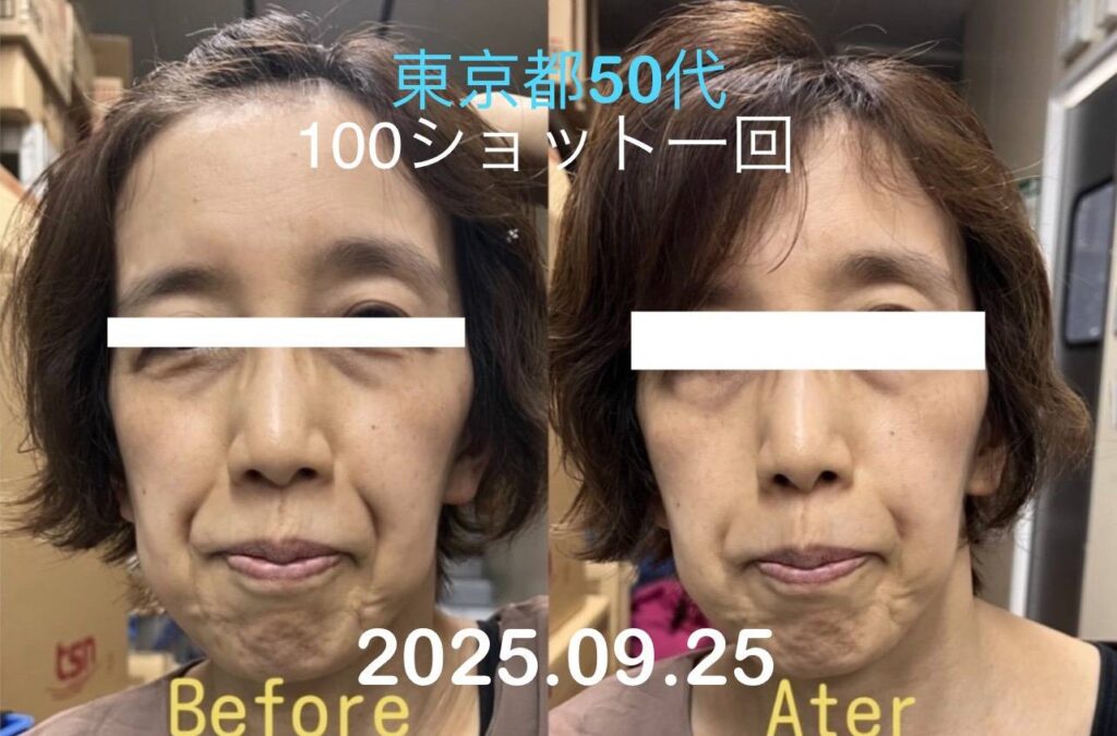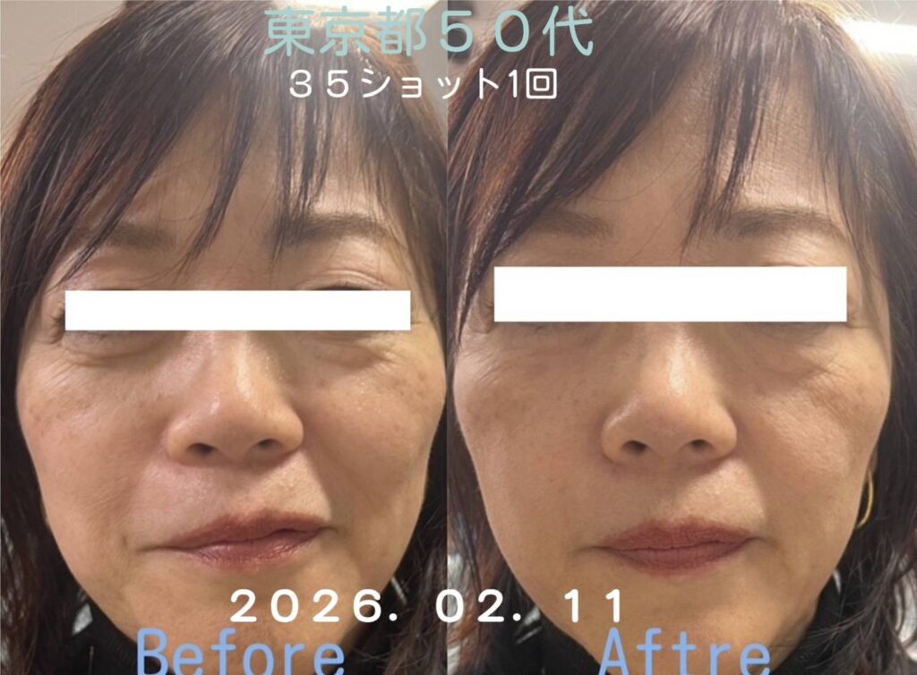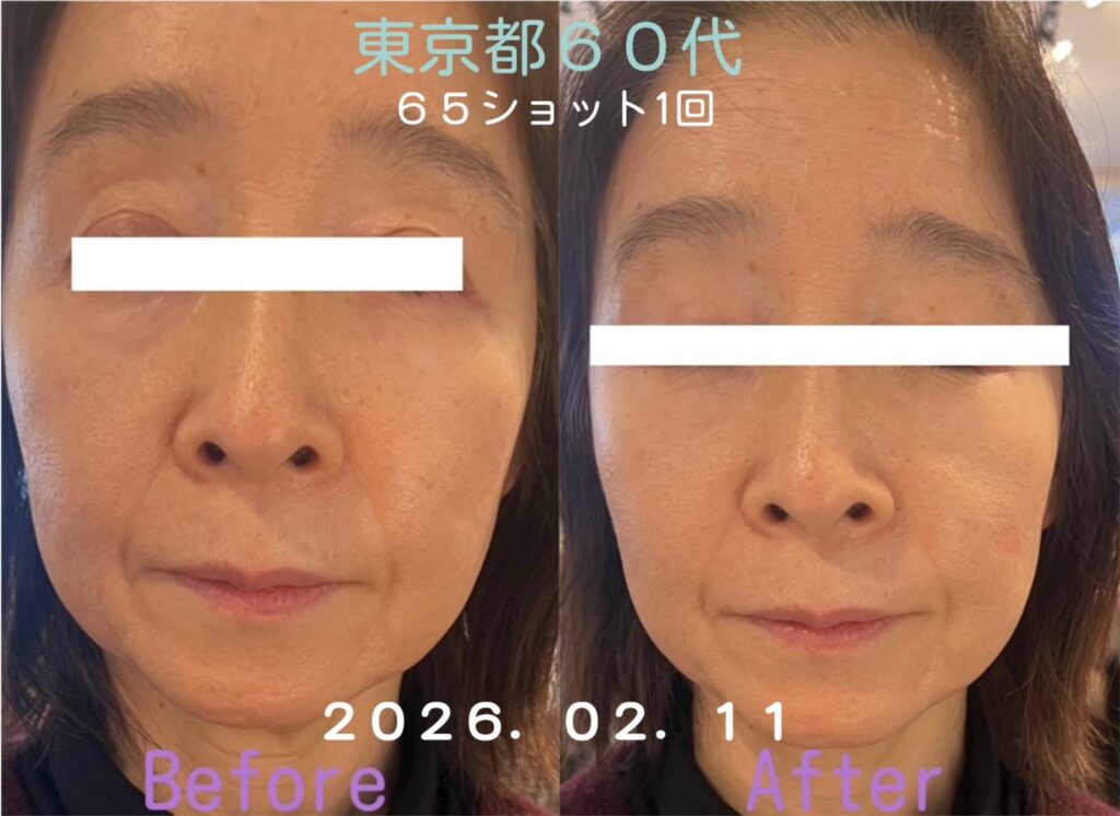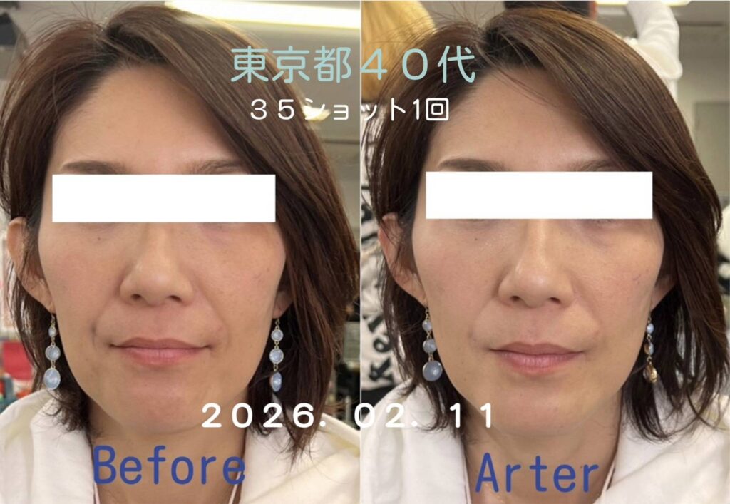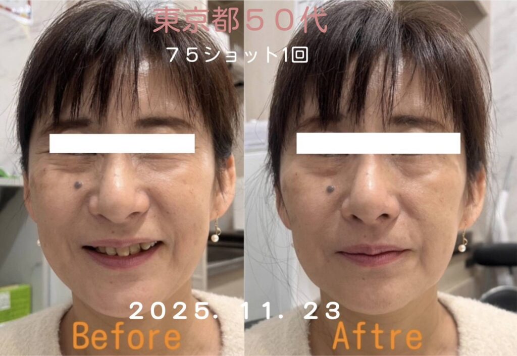 施術後、気になっていたほうれい線が徐々に薄くなっていった。目の下のたるみが引き上がり、肌トーンがより明るい印象になりました。